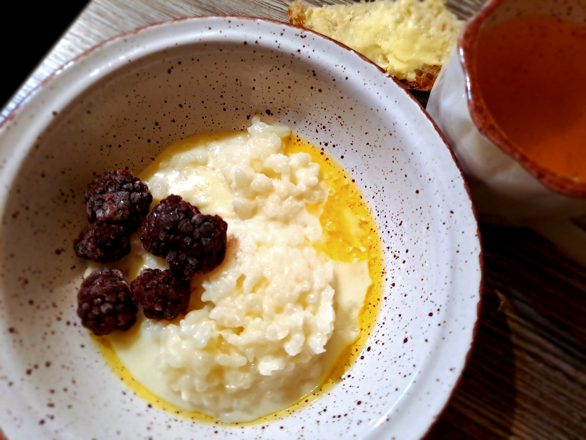 На завтрак рисовая каша с еживикой, домашний хлеб с маслом,облепиховый чай.