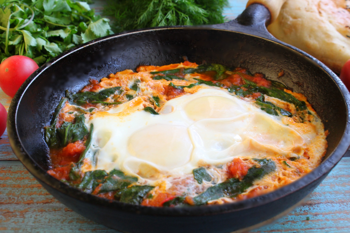 Яичницы готовлю каждый день и всегда хочется испробовать новый рецепт этого незамысловатого завтрака. Такая яичница понравится многим, она получается действительно вкусная! Можно оставить такую яичницу глазуньей, можно приготовить яичницу перемешку, по вашему настроению. Яичница будет с легкой кислинкой, яркая, сочная, легкая и аппетитная. Встретился мне на базаре крупный шпинат, не могу пройти мимо, обязательно покупаю, любим блюда из шпината. Яйцо куриное - 2 шт. Шпинат - 50 г. Помидоры - 2 шт. Масло сливочное - 20 г. Черный молотый перец, соль - по вкусу Сливочное масло растопим на сковороде, помидоры натрем через терку или измельчим блендере. Выкладываем томатную массу на сковороду и выпариваем массу 3-4 минуты, помешиваем. Если шпинат мелкий, то добавляем целые листья, если крупный, то рвем листья на части и выкладываем на сковороду. Пару раз перемешиваем шпинат, чтобы ушел объем у зелени, добавляем соль и черный молотый перец по вкусу, перемешиваем. Вбиваем яйца на сковороду, на