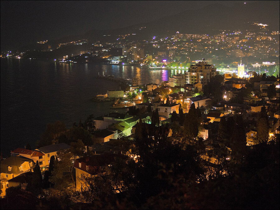 И Ялта отсюда открылась по-новому — с такой близкой отсюда колокольней Святого Иоанна Златоуста на переднем плане перед всегдашней сияющей россыпью огней. И внизу, как на ладони, светилось огоньками и фонарями целое море домиков, крыши, окна, переулки, тропинки, кипарисы. Это было словно мозаика, и мы долго любовались её завораживающими фрагментами.