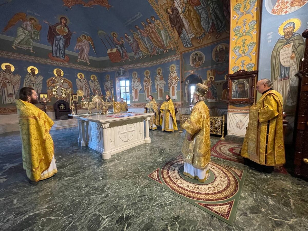 Владыке сослужили архимандрит Серафим (Лопухов), иеромонах Иоанн (Плетминцев), игумен Виталий (Уткин), иерей Георгий Алексеев, протодиакон Павел Коник, иеродиакон Авксентий (Фокин) и иеродиакон Варнава (Лагута).