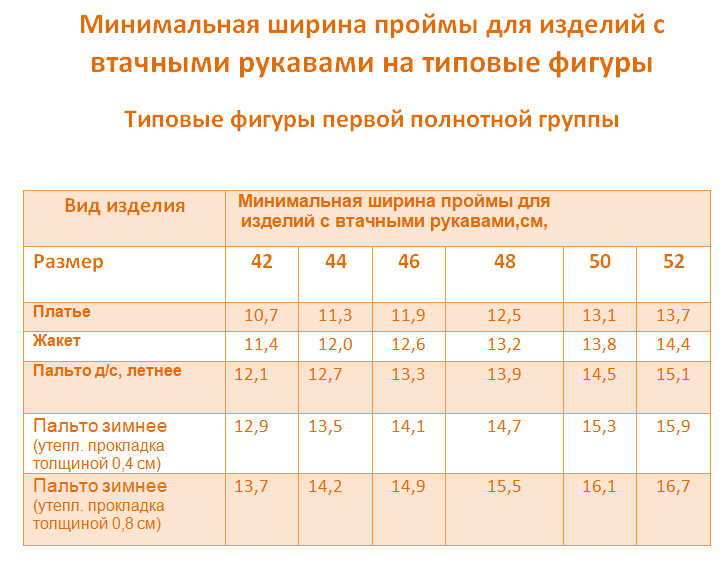 Минимальная ширина проймы для изделий с втачными рукавами на типовые фигуры