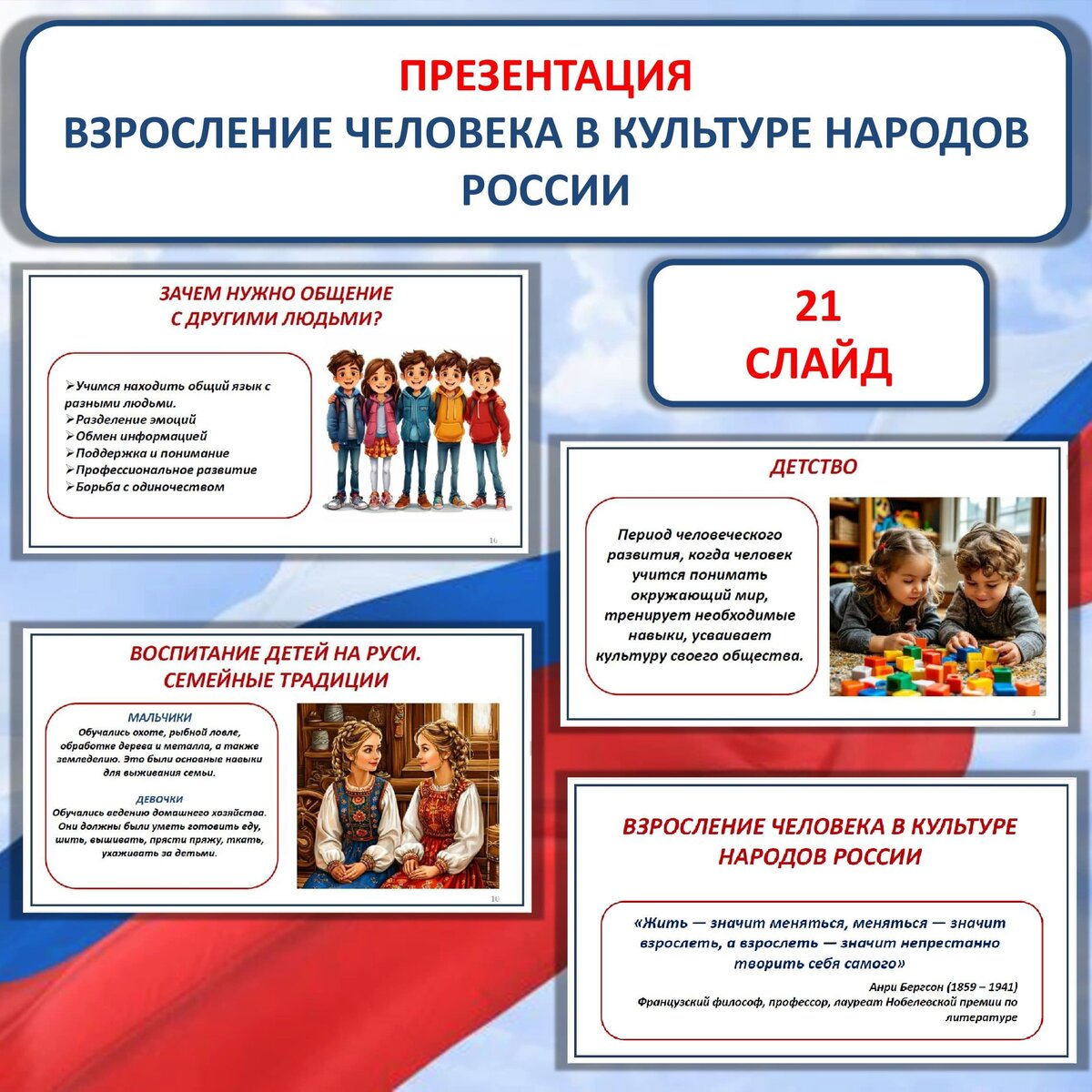 Скачать здесь Презентация «Взросление человека в культуре народов России» разработана к уроку ОДНКНР в 6 классе в соответствии с ФОП. Презентацию можно использовать как отдельно, так и в комплекте с рабочим листом (ссылка дана ниже) Презентация состоит из 21 слайда. Слайды №16, 17, 19, 20 анимированы, чтобы у учителя была возможность организовать беседу или дискуссию на уроке. По щелчку появляются ответы. Слайд №1. Титульный слайд. Высказывание Анри Бергсона «Жить — значит меняться, меняться — значит взрослеть, а взрослеть — значит непрестанно творить себя самого» Слайд №2. Что такое возраст. Слайд №3. Детство. Слайд№4. Подростковый возраст. Слайд №5. Юность. Слайд №6. Средний возраст (зрелость). Слайд №7. Пожилой возраст. Слайды № 8 -9. Взросление в культуре народов России. Древние традиции. Слайды № 10-11. Воспитание детей на Руси. Семейные традиции. Слайд №12. Современная Россия. Слайд №13. Возраст – это не только годы! Слайд №14. Проблема одиночества. Слайд №15. Зачем нужно общен