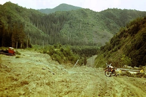 – Осмотрели мы площадку с техникой, пошагали по её неровностям, поразглядывали и пощупали эту технику. Поудивлялись тому, что в верховьях сопок вдруг обнаружились ровное плато с большим количеством деревьев, пригодных для промышленной валки. Повосхищались в очередной раз сахалинскими просторами и снова сели на мотоциклы. Дорога здесь не заканчивается, она уходит дальше, поднимается ещё немного вверх, и мы выезжаем на самый натуральный перевал, где дорога переваливает через свою верхнюю точку на другой склон гряды сопок. Верхушка сопки срыта, по свежим следам видно, что совсем недавно. Дальше новое ущелье, дорога уходит вниз в широкую пойму ущелья, густо заросшую хвойным лесом. Спустились вниз по только что пробитой дороге среди деревьев. На удивление внизу довольно ровно и просторно, только толком ничего не видно из-за деревьев. Дорога неожиданно делает разворот среди деревьев и замыкается в кольцо. Понимаем, что - всё, дорога кончилась! Останавливаемся, глушим моторы. Совсем недалеко за деревьями слышится шум реки.