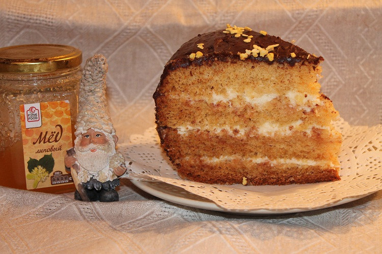 Очень простой медовик, воздушный, пышный и мягкий. Простота в том, что тесто с медом не нужно, как обычно в медовиках, нагревать на водяной бане. Я выпекала в мультиварке. Смазала чашу мультиварки сливочным маслом, можно, но необязательно, сверху масла присыпать сахарным песком. Продукты (граненый стакан объемом 200 мл): Тесто - яйца 5 шт. - сахар 1,5 стакана = 270 гр (в 1 стакане = 180 гр сахара) - мед 4,5 ст. ложки = 135 гр (1 ст. ложка = 30 гр) - сода 0,75 ч. ложки - разрыхлитель 1,5 ч. ложки - мука 3 стакана = 360 гр (в 1 стакане = 120 гр муки) Здесь нужно соблюдать очень важное правило: если в тесте есть разрыхлитель или/и сода, то их нужно добавлять в последнюю очередь и сразу выпекать. Потому что разрыхлитель очень быстро теряет свои свойства и бисквит может не подняться. - Муку смешиваем с содой и разрыхлителем и отставляем в сторонку. - Яйца миксером взбить с сахаром, как для бисквита, то есть в очень крепкую пену. Не прекращая взбивать, добавить постепенно растопленный (не г