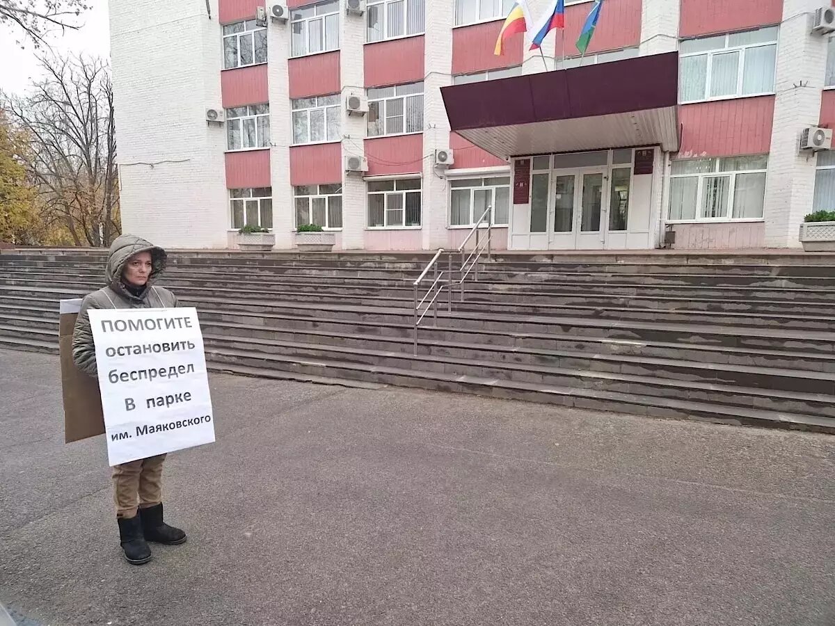 Местная жительница привлекает внимание властей к проблемам благоустройства города. На ее табличке написано: «Помогите остановить беспредел в парке имени Маяковского на улице Чернышевского».