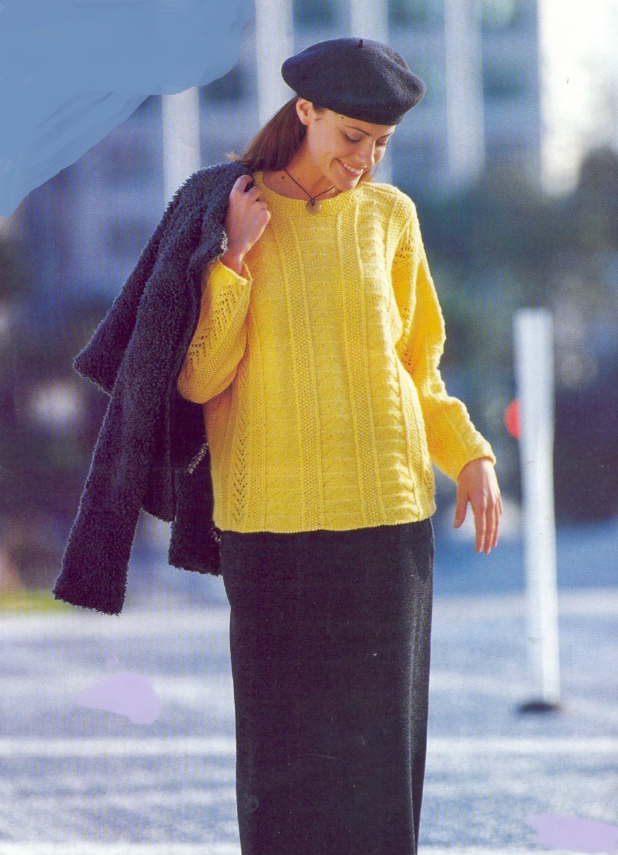 У этого пуловера такое же красивое сочетание узоров, как и у предыдущей модели. Только вариант ажурного узора заменен косами. Использована пряжа с добавлением хлопка. Удобство придают не только свободные рукава, но и глубокий V-образный вырез горловины. Размер по выкройке 40-42.
