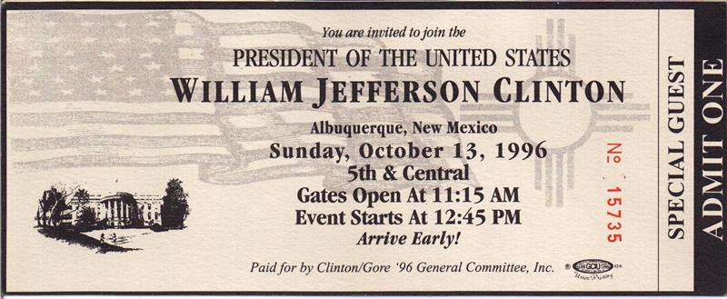 Итак, 12 октября фиеста закончилась. Вечером мы забрали из СТО отремонтированную машину. Утром 13 октября вся российская команда музыкантов-воздухоплавателей уехала в аэропорт, а Сергей и я пошли на предвыборный митинг Билла Клинтона. Через три недели в США президентские выборы. Друг Билл приехал агитировать альбукеркцев и нью-мексиканцев за себя и своего друга вице-президента Альберта Гора. Накануне организаторы фиесты презентовали участникам по пригласительному билету. Грех не воспользоваться и не поглазеть на президента-саксофониста.