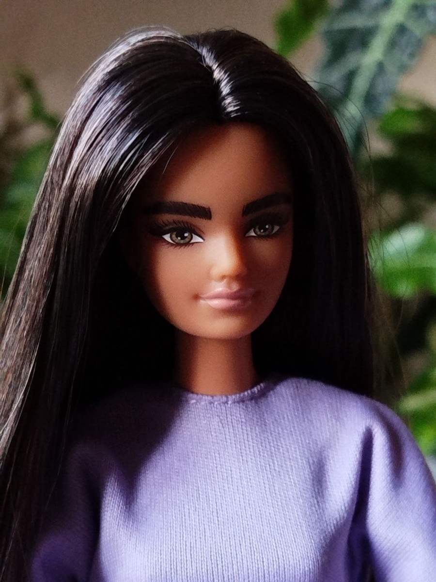 Раз уж речь зашла о гештальтах, напишу о ней😊 Когда прошлой осенью меня с новой силой накрыло куклохобби (читай: куклоголизм), и я начала восполнять пробелы в знаниях - выпуски, молды, популярные куклы и любимчики коллекционеров.... - вот эту девушку, в отличие от Кэма, мне захотелось поселись сразу. Её, Дачницу💗 Смуглая брюнетка с таким взглядом серо-зелёных глаз, что у меня сложилось представление о какой-то интересной её внутренней жизни, за которой мне хотелось бы наблюдать. Усы, говорите? а я вот люблю Фриду Кало. Усы, монобровь и вот это всё. Южанка! И поэтому с прошлого года я её ищу. Искала)) Искала только голову, т.к. была уверена, что тело нужного скинтона есть. Ошибалась - тело оказалось светлее, но к этому времени у меня уже появились две Мбили-косички. Одной решила пожертвовать 😥 на некоторых фото виден разнотон - примерно как у Брендона с его родным телом. Но жить можно)) В процессе поиска поняла, как трудно найти Дачницу с не-удлинённым внутренним уголком правого г
