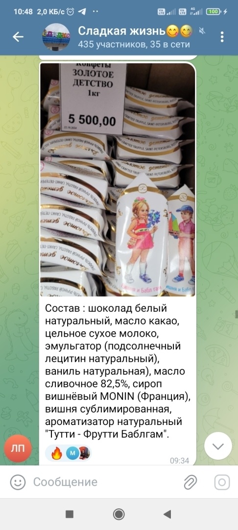 Вот и наступил одиннадцатый месяц 2024 года, не успеешь глазом моргнуть, как и новый год. Пора наверное уже задуматься о новогодних подарках детям, второй половинке, родителям, друзьям, коллегам. Универсальным подарком на новогодние праздники являются сладости. Конфеты дарят всем, и детям и взрослым, и друзьям и коллегам по работе. Сладкое любят все. Выбор конфет сейчас огромный. Сегодня хочу провести анализ цен на шоколадные конфеты, которые привезли к Новому году в мой город. Названия магазинов «Услада» и «Сладкоежка» говорят сами за себя. Ассортимент этого магазина разнообразные сладости, основной ассортимент конечно же конфеты. Уже в октябре в магазин завезли конфеты к новогодним праздникам. Цены от 4700 руб. до 6100 руб. Конфеты элитные. Посмотрим с Вами, что можно купить Есть среди читателей любители белого шоколада. Вам обязательно нужно попробовать конфеты «Золотое детство». Цена за 1 кг 5500 руб. Состав конфет натуральный : белый шоколад, масло какао, цельное сухое молоко, мас