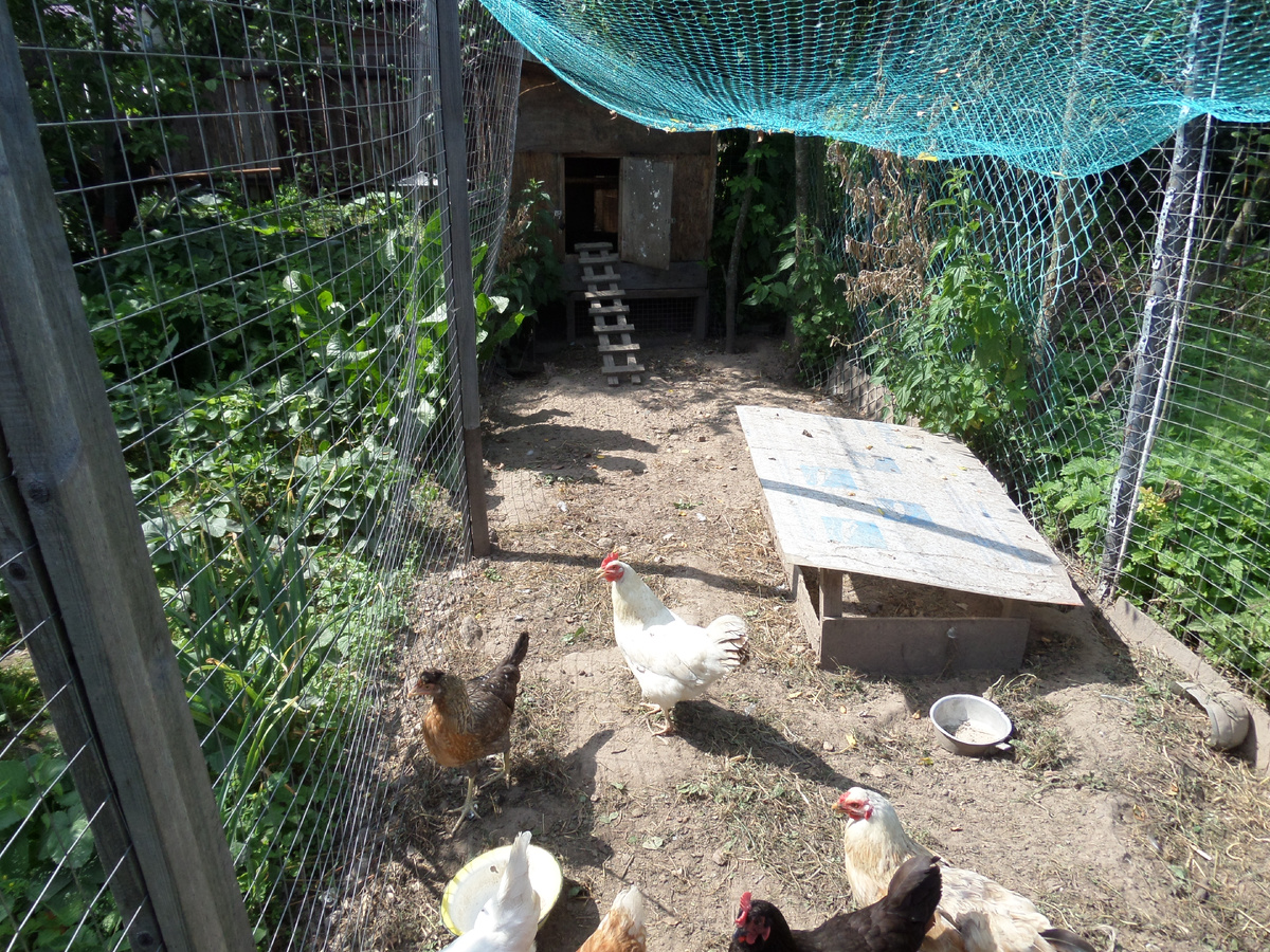 Выгул для кур — это не просто лишнее пространство к курятнику. Он выполняет несколько функций. Во-первых, куры получают солнечные ванны. Что способствует усвоению витамина Д и соответственно улучшает здоровье курицы и поднимает яйценоскость. Во-вторых, на выгуле куры подбирают песок и мелкие камушки, что необходимо им в связи с таким устройством пищеварения. В-третьих, пасутся там щипая травку. Если травки уже нет, именно на выгул можно высыпать ведро сорняков или ботвы и куры с удовольствием будут рыться в этой куче собирая то, что им нужно. Устроить выгул довольно просто, огородить пространство возле курятника сеткой и сделать выход туда из самого курятника. Сверху необходимо тоже натянуть сетку, не обязательно железной. Я, например натягиваю обычную капроновую сетку для огорода с размером ячейки от 2 до 5см. На сезон хватает. Верхняя сетка выполняет две функции. Не дает курам выбраться с выгула и защищает от хищных птиц. Только этим летом у меня на глазах ястреб перепелятник дважды