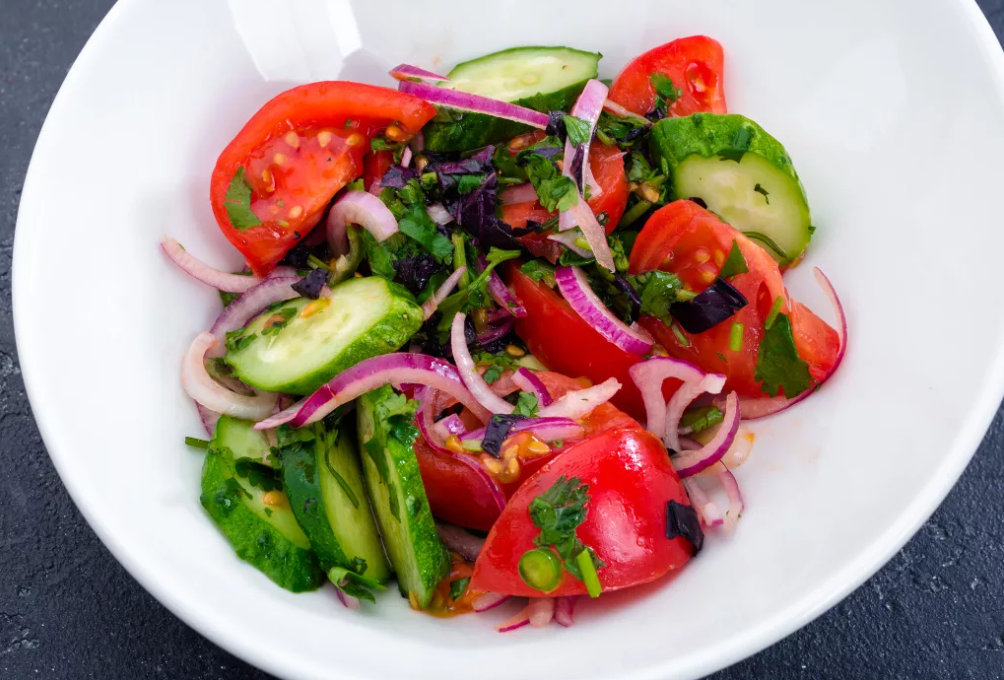Ингредиенты: - консервированный тунец, - листья салата, - помидоры, - огурцы, - оливковое масло, - лимонный сок, - винный уксус. Филе тунца раздавить вилкой, овощи нарезать в зависимости от предпочтений. Смешать ингредиенты, посолить, заправить маслом, уксусом и лимонным соком. Вместе тунца можно использовать обжаренные креветки.