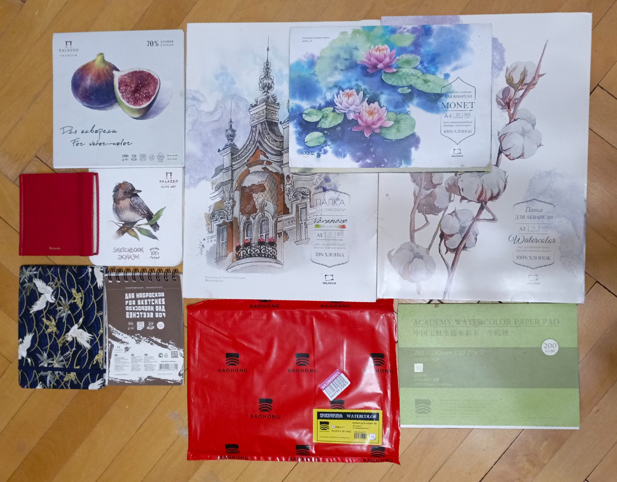 Про бумагу для акварели говорят что нужен 100% хлопок и стоит она как крыло самолёта. До недавнего времени действительно была в основном очень дорогая бумага. Но с некоторых пор наши компании стали подтягиваться и тоже выпускать бумагу. По стоимости гораздо бюджетнее многих европейцев. В общем как только стали появляться наши альтернативы и бумагу китайского производства, их стала покупать. На фото еще не вся бумага. От Невской хлопковую ещё пробовала, но обложки не сохранились и бумагу с кошками от Лилии холдинг хлопковую. Но обо всем по порядку. Самая универсальная это пожалуй хлопковая от Baohong и Mone от Малевичъ, но это по моим ощущениям. Баохонг выпускает бумагу разных форматов и разные варианты. Склейки, рулоны разной высоты, в листах и сшитая в блокноты. Можно купить на маркетплейсах. В красной упаковке как раз заказывала на маркетплейсе. Для акварели подходит не только хлопковая но смесовая. У Малевичъ сейчас очень много разных серий бумаги. Серия Веронезе хоть и по ощущени