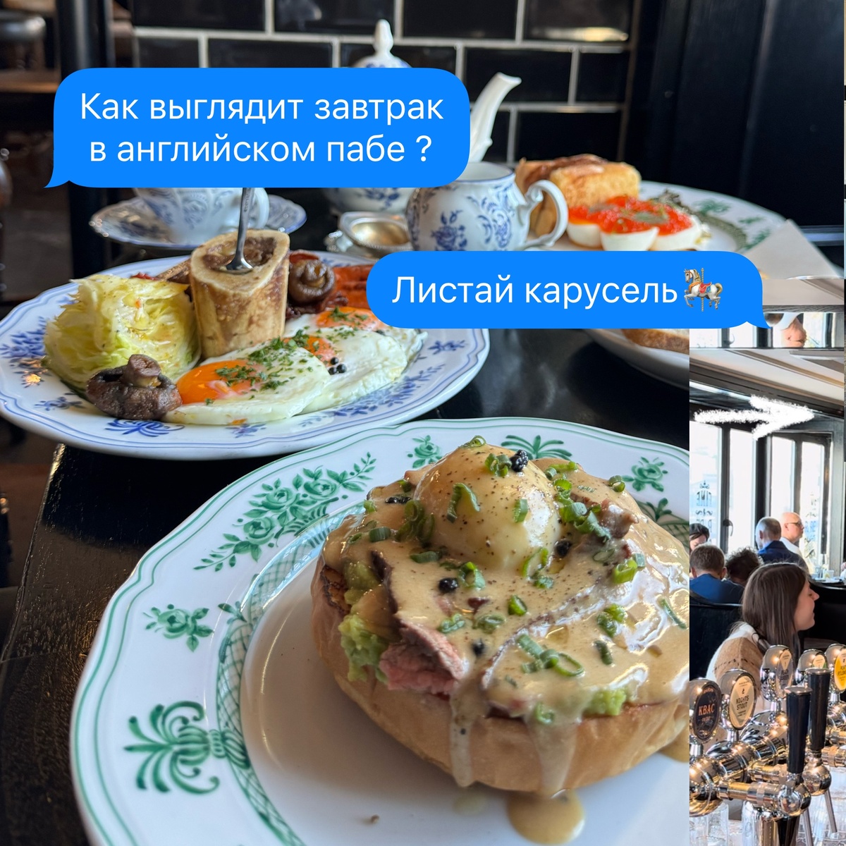 Посетил один из именитых английских пабов Петербурга - Black chops. 📌наб. Фонтанки 5/2 С первого взгляда впечатляет как подобрана каждая деталь интерьера, много антиквариата с блошиных рынков, а так же заказанных из самой Англии. Атмосфера там царит душевная и приятная, персонал чуткий и внимательный. Блюда подаются в шикарной винтажной посуде, хочется её разглядывать. Получаешь эстетическое удовольствие от того, что ешь в красоте. По вкусу чувствуется сбалансированность ингредиентов и текстур. Нет резких вкусов и ароматов (хотя кое-где бы хотелось добавить). Но это однозначно одни из лучших вариантов завтраков. Так, перейдем же ценам. Канонический английский завтрак - 1450 (включая напиток пиво/квас/фильтр кофе). Шакшука острым томатным соусом - 950. Яйца с красной икрой - 1250. Стейк Бенедикт - 1250. Минси пай 2.0 -370. Ватрушки - 390. Ценник заряженный, но для такого уровня заведения вполне оправдывает. В посте видны позиции, которые брали. А вы как считаете?