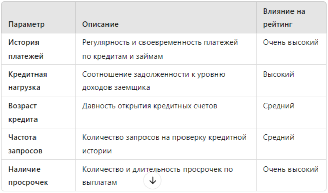 Рейтинг рассчитывается по сложной системе, учитывающей множество факторов. Рассмотрим основные параметры, влияющие на кредитный рейтинг: