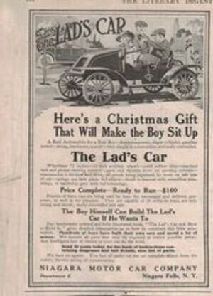 В 1912 компания Lad's car решила при выпуске автомобилей, помочь автолюбителям сэкономить деньги. Компания Niagara Motor Car Corporation из Ниагара-Фолс, штат Нью-Йорк, построила одноместный детский автомобиль с воздушным охлаждением мощностью 4 лошадиные силы и ременным приводом. Продаваемый как автомобиль для мальчика, он рекламировался как "предоставляющий детям с механическим складом ума "надежное" транспортное средство с "надежным" двигателем". Кроме того, что автомобиль Lad's car рекламировался как детский автомобиль, он считается еще и первым кит-каром ( автомобилем, который покупатели собирали сами) Lad's car выпускался в собранном виде за 160 долларов и в разобранном 140 долларов, также покупая автомобиль в разобранном виде, люди экономили на налогах.