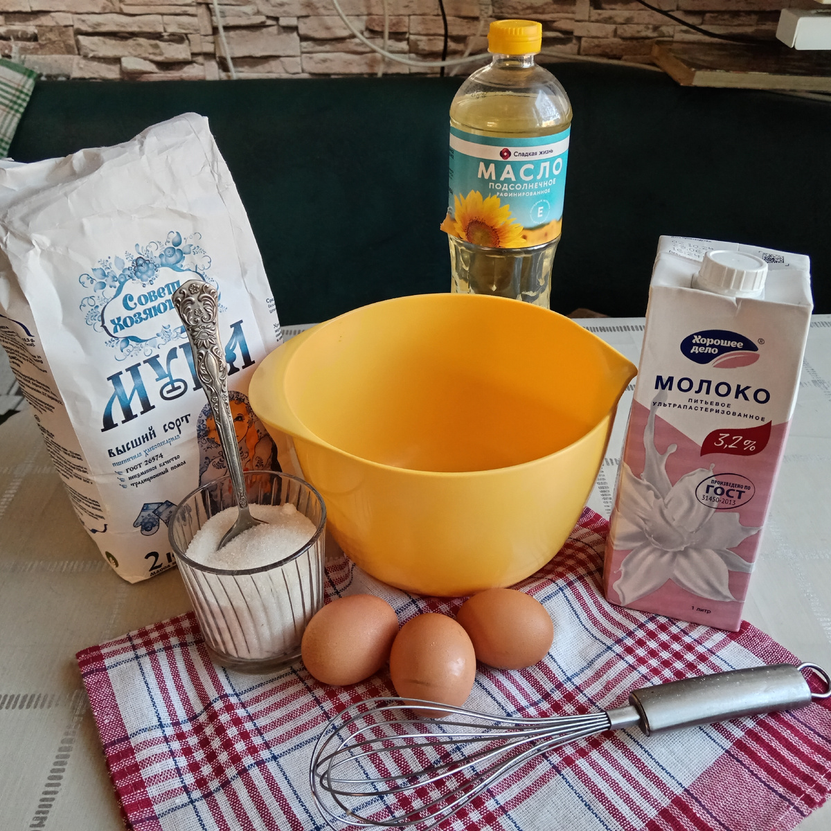 И сразу рецепт: Молоко 0,5 литра Вода 0,5 литра Сахар 1-2 столовых ложки Яйца 3 штуки Соль 0,5 ч. л. Разрыхлитель 1 ч. л. Растительное масло 3 ст. л. Мука 11 столовых ложек Взобьем яйца с сахаром, Добавим соль, разрыхлитель. Как следует взбиваем. Я люблю чтобы блинчики были ни сладкие, ни пресные а были ближе к солёным. Для меня это не только десерт, но и полноценное второе блюдо. Вливаем воду комнатной температуры, просеиваем и насыпаем муку в тесто. Тщательно мешаем. Теперь вскипятим молоко и будем тонкой струйкой вливать в тесто. Теперь добавим немного масла растительного и дадим постоять полчаса. Все, можно начинать печь блинчики. Сковорода у меня блинная, очень хорошая, с толстым дном. Разогреваем на самом большом огне, смазываем растительным маслом. Потом чуть убавляем огонь, чтобы тесто не горело. Из этого объема теста получается 20 больших блинов. А теперь вторая часть нашего блюда! Лук обжарим на растительном масле. Добавим фарш, обжарим, Добавим варёный рис,