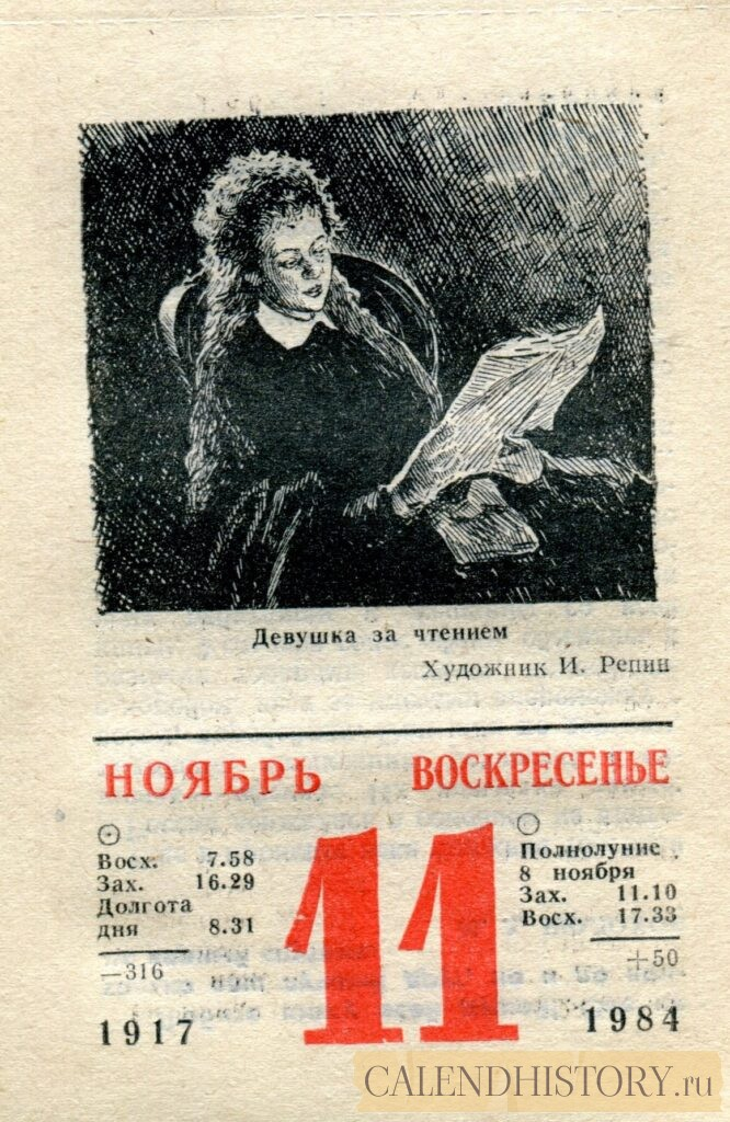 Итак, сегодня 11-го ноября и у нас на календаре 1984-й год. Перед нами листок советского календаря для женщин за этот день. На календаре у нас воскресенье - 11 ноября 1984-го года. Девушка за чтением