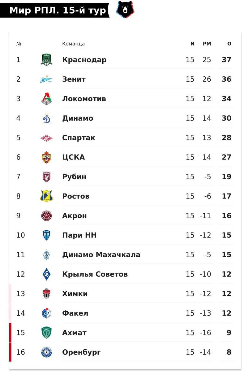 В Мир РПЛ доиграли 15-й тур, с такой таблицей уходим на международную паузу – и готовиться ко вторым встречам всех соперников между собой.