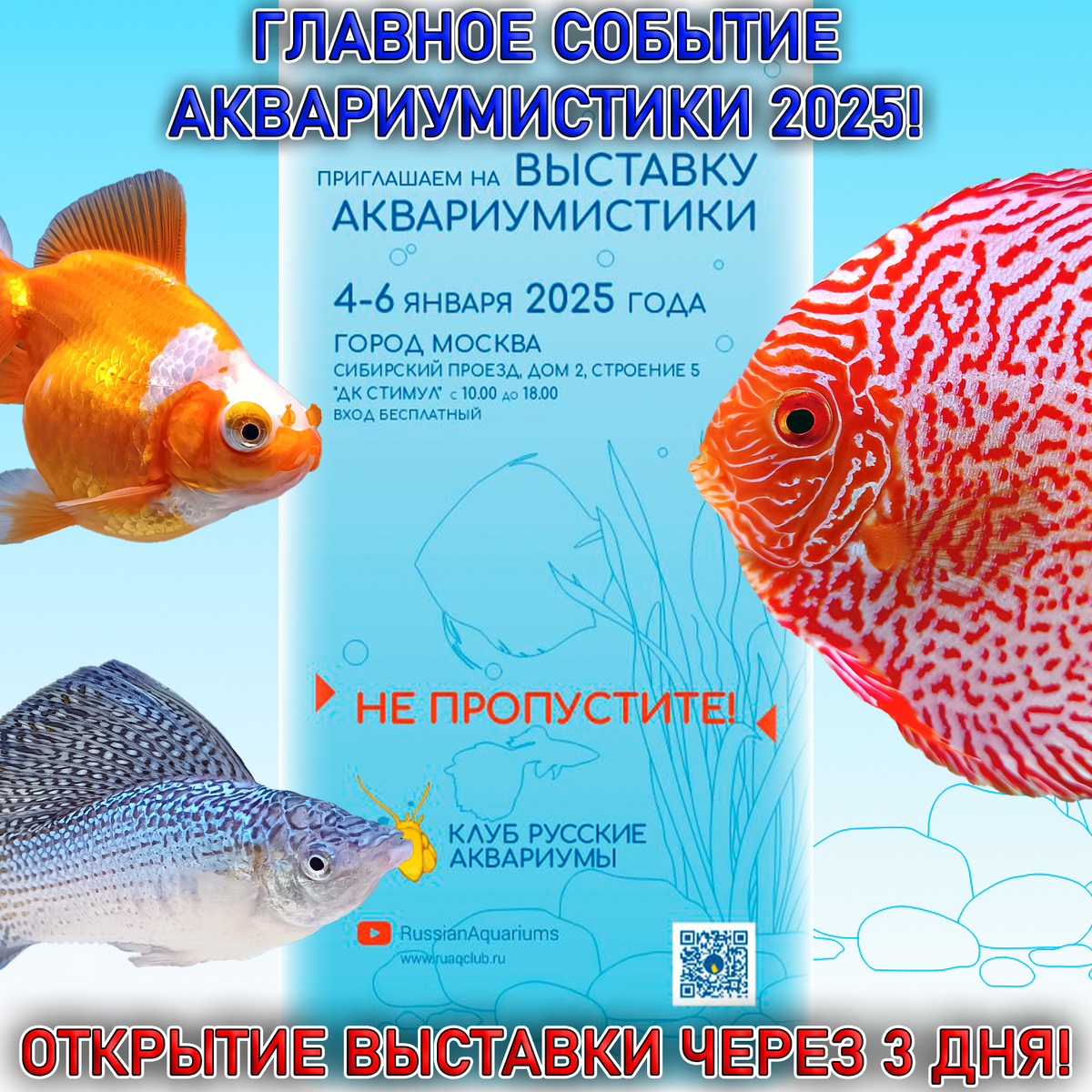 Выставка аквариумных рыбок откроет свои двери для посетителей уже в этом году, а именно через 3 дня! УЖЕ СКОРО ВЫ СМОЖЕТЕ УВИДЕТЬ редких, интересных аквариумных рыбок, красивые акваскейпы, травники и т.п. Не упустите возможность! 👇ВЫСТАВКА АКВАРИУМНЫХ РЫБОК👇 МЕСТО: г. Москва, Сибирский проезд д. 2 стр. 5, ДК Стимул ДАТЫ: 4,5,6 января 2025 года с 10:00 до 19:00. ВХОД БЕСПЛАТНЫЙ! Сайт выставки: https://ruaqclub.ru/ Страница с информацией о выставке: https://ruaqclub.ru/vystavka-2025/ На выставке будут представлены аквариумные рыбки наших российских разводчиков и селекционеров. Вы сможете полюбоваться прекрасными дискусами, скаляриями, меченосцами, гуппи, пецилиями, велиферами, формозами, петушками и другими пресноводными аквариумными рыбками. Также на выставке будут представлены оформленные аквариумы акваскейпы от известных и неизвестных аквариумистов! Я (Юный Аквариумист) также буду участвовать в этом мероприятии. Мой аквариум скейп на прошлой выставке: Также на прошлой выставке я пре