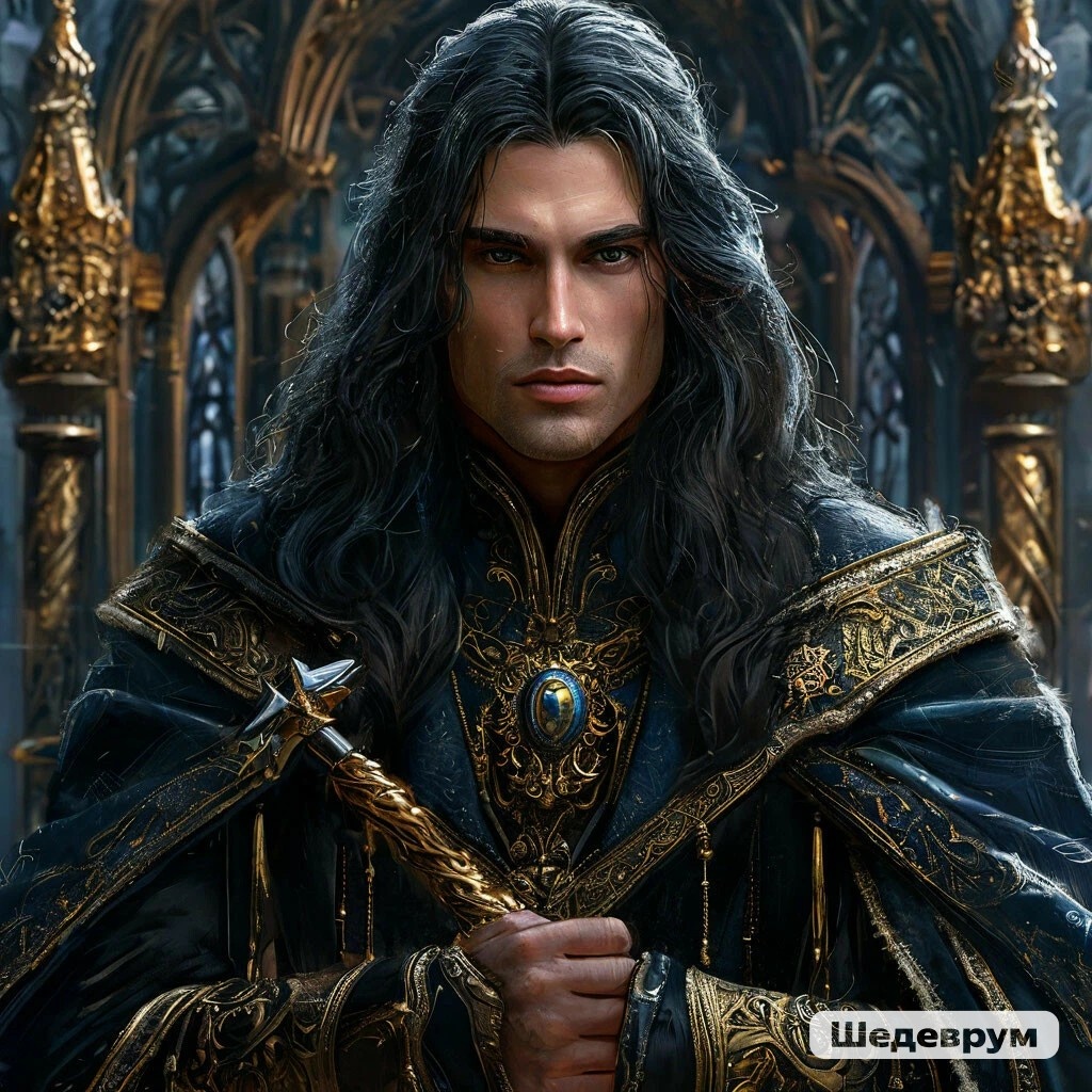 Его облик внушал трепет и уважение. Высокий, с тёмными волосами, спадающими волнами по плечам, он выглядел одновременно грозно и величественно. Глаза его были холодны, как зимний ветер, но иногда в них вспыхивал огонь, который мог бы растопить сердце самого стойкого воина. Лицо его казалось высеченным из мрамора, но при этом оно не было лишено мягкости и загадочности.
