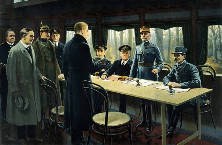 11 ноября 1918 года в Компьенском лесу во Франции, в железнодорожном вагоне, между странами Антанты и Германией было подписано перемирие, ставшее прологом к Версальскому мирному договору, который подвел итоги Первой мировой войны. Весной 1918 года Германия, заключив с Россией Брестский договор, добилась выхода последней из войны, ликвидировав тем самым Восточный фронт. Теперь кайзеровская империя могла сосредоточить оставшиеся силы на Западном фронте. Однако осенью ситуация однозначно сложилась не в пользу Германии: к Антанте присоединились США. Верховное командование объявило Вильгельму II о безнадежности германского положения. Начались мирные переговоры. Но из-за требования президента США Вудро Вильсона об отречении Вильгельма переговоры затянулись. Затягивание переговоров привело к обострению политической и социальной обстановки внутри Германии. Начались массовые митинги, демонстрации, революционные восстания коммунистов на флоте и в армии. Опасаясь российского сценария, г