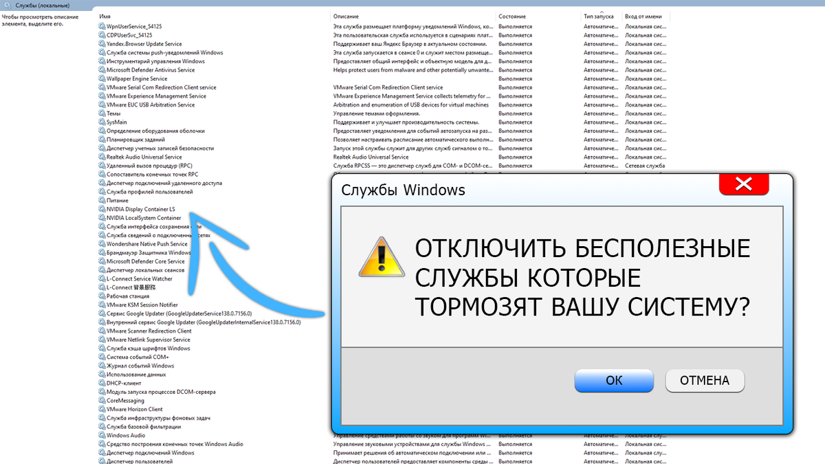 Есть очень важные службы которые не стоит отключать, по типу: планировщика заданий или удаленного вызова процедур (RPC), службы Nvidia, если вы за «зелёных» и AMD если за «красных».