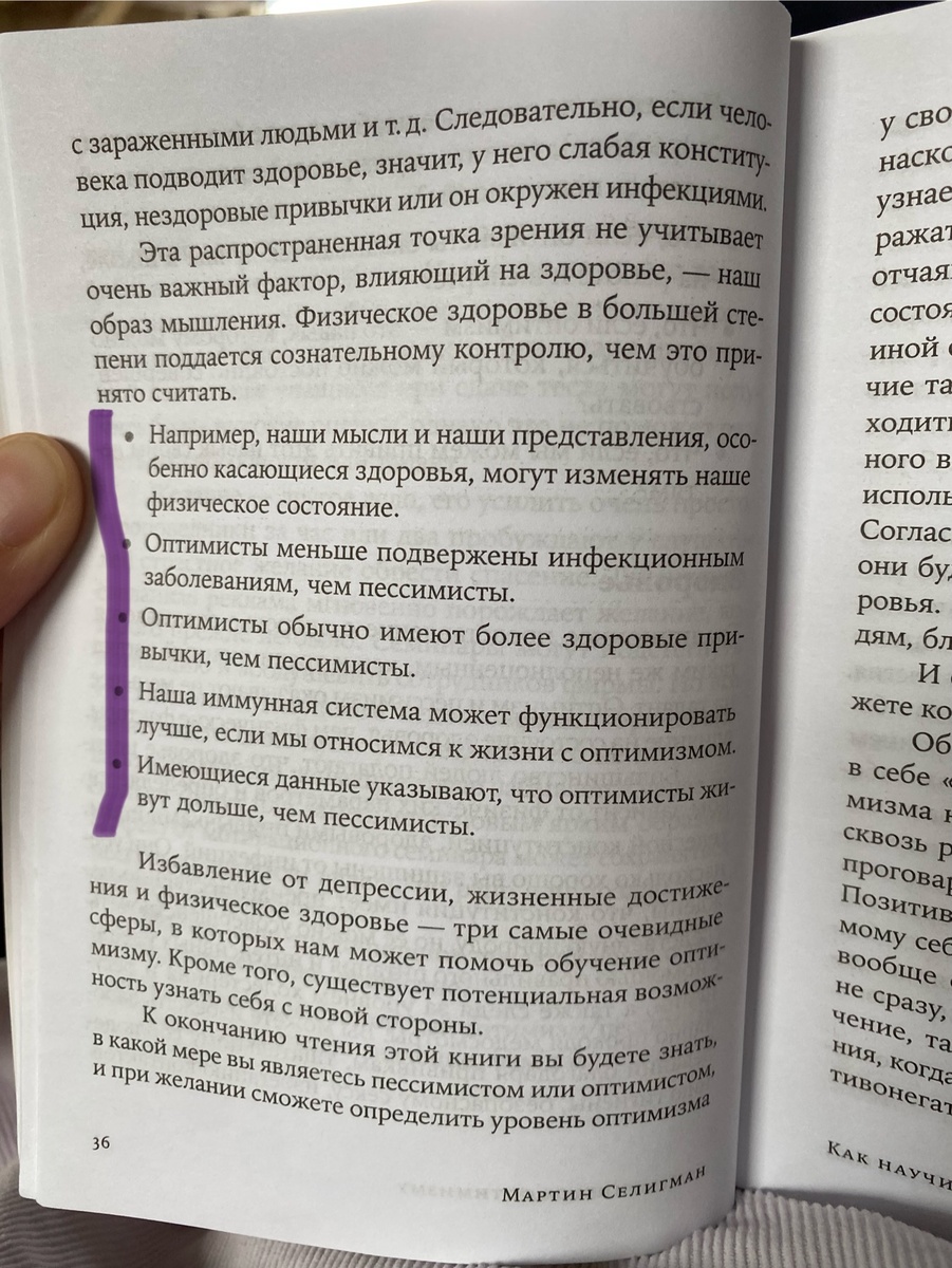Стиль мышления влияет на здоровье, на достижение целей, на продолжительность жизни и на лечение депрессии. Автор приводит много исследований с результатами. И что меня поразило: есть такое понятие «стиль объяснения». Это то, какими словами вы самому себе трактуете, что с вами произошло в ситуации. Часто эта мысль автоматическая, протекает за секунду. И здесь не про усилие воли и желание показаться другим людям позитивным. Здесь про глубинное мышление, кем вы себя считаете по жизни: счастливчиком или страдальцем. И вот этот стиль объяснения формирует наше с вами здоровье и гормональную систему. Мне понравилось замечание одного психолога: что сколько железа не принимай, если вы истощены эмоционально, никакое железо и витамины не усвоятся. Все взаимосвязано и физика, и психика. Все единое целое. И это потрясающе, я считаю. Этот факт учит быть бережным к себе как со стороны питания, сна, физической нагрузки, так и со стороны мышления.