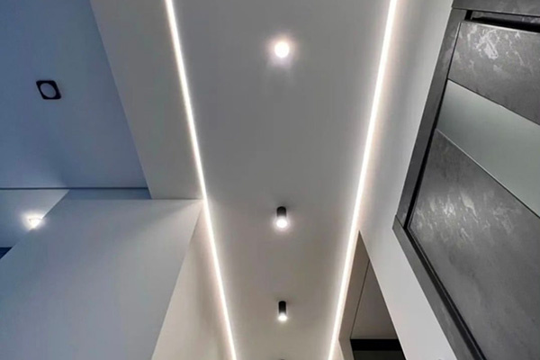- Выбор профиля. Для создания эффекта парящего потолка используется специальный алюминиевый профиль с углублением для светодиодной ленты. Выбор профиля влияет на внешний вид потолка и распределение света, поэтому лучше обсудить этот момент с дизайнером или мастером по установке.