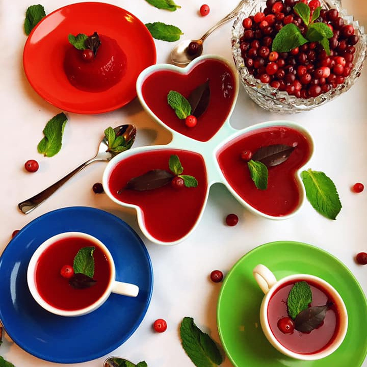 Клюква - одна из самых полезных ягод. Она укрепляет иммунитет, ускоряет процесс заживления ран, улучшает кровообращение. Лакомиться клюквой можно всю зиму, достаточно просто разложить чистую сухую ягоду по пакетикам и заморозить. Я люблю добавлять ее в салаты, смешивать с творогом, заваривать в чай. И, конечно, как и любая ягода, она подходит для приготовления желе. Вкус его - чуть терпкий, с легкой горчинкой. Его хорошо подавать в конце обеда. Нам понадобится: ✔ 250 г свежей клюквы; ✔ 25 г желатина; ✔ 500 мл воды; ✔ Подсластитель (у меня - стевия); ✔ Мята (для украшения). Как готовим: Желатин заливаем небольшим количеством тёплой воды, оставляем набухать. В дуршлаг высыпаем ягоду, моем её. Дуршлаг ставим в миску, и толкушкой хорошо отжимаем ягодный сок. «Отжимки» заливаем 500 мл воды, доводим до кипения, кипятим 1-2 минуты, снимаем и процеживаем. В процеженный отвар добавляем сок, подсластитель и желатин. Доводим до кипения, но не кипятим (!), снимаем с огня и разливаем по пиалам или