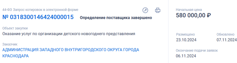 На сайте госзакупок проведён отбор поставщика услуг по организации детского новогоднего представления. Заказчиком, согласно проекту муниципального контракта, выступает администрация Западного внутригородского округа Краснодара. На мероприятие планируют потратить 580 тысяч рублей. В техническом задании указано, что новогодний праздник проведут в городе 25 декабря. Он будет включать в себя музыкально-драматическое представление «с атмосферой волшебства, с захватывающим сюжетом без излишней нравоучительности и назидательности в пользу буйства фантазии, со звуковыми и световыми спецэффектами», протяжённостью 1-2 часа, которое подойдёт для детей от 3 до 14 лет.