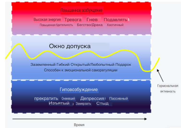 Наше тело всегда вырабатывает гормоны, чтобы попытаться удержать нас на максимально возможном уровне (гомеостаз). Когда наши гормоны более ровные (в пределах нашего окна толерантности), мы чувствуем себя более способными справляться с ситуациями соответствующим образом. В пределах этого окна мы способны адаптироваться, способны эмоционально саморегулироваться и более гармонично справляться с триггерами. Однако, у всех нас есть предел того, что мы можем выдержать в любой момент времени. Когда вещи становятся слишком тяжелыми для нас, наши гормоны реагируют одним из двух способов за пределами нашего окна: