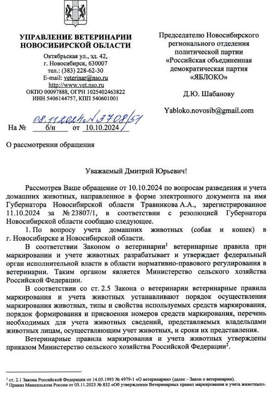 Зоозащитники Новосибирского реготделения «Яблока» считают, что и после введения в действие Федерального Закона «Об ответственном обращении с животными» в 2018 г. проблемы с владельческими животными и их владельцами остаются на прежнем уровне или усугубляются. Поэтому мы сделали запрос руководителю Правительства Новосибирской области. Наши вопросы и ответы Управления ветеринарии НСО читайте в приложенных скриншотах.