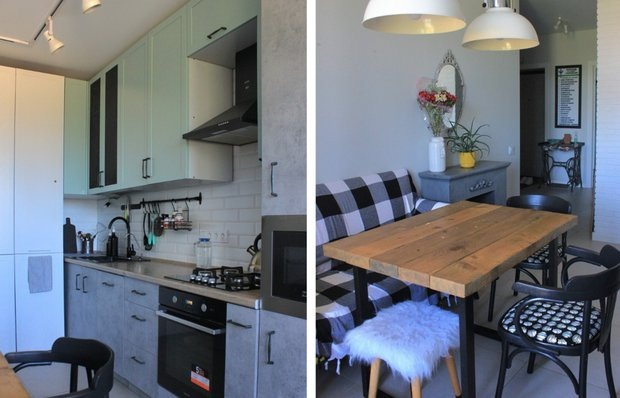 Кухня у нас просторная, площадью 14,5 кв. м., поэтому она выполняет и роль гостиной. Мы начали с планировки освещения и расположения розеток и приборов. Кухонный гарнитур проектировали сами и заказывали распил ЛДСП по чертежам. Фасады выбрали позже: под бетон, а также в мятном и белом оттенках.