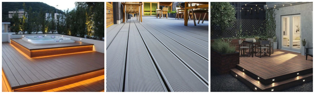 В сегменте рынка строительных и отделочных материалов сравнительно недавно появился новый продукт — древесно-полимерный композит. Этот искусственный материал совмещает в себе лучшие свойства пластика и древесины. Характеризуется уникальным сочетанием внешней привлекательности, практичности, долговечности и технологичности. Производится ДПК, чаще всего, в виде панелей и террасной доски. Область применения древесно-полимерного композита непрерывно расширяется, что обусловлено высокими эксплуатационными свойствами строительно-отделочного материала. Наибольшей популярностью пользуются фасадные панели и террасная доска. Используют их для облицовки фасадов построек, обустройства разнообразных настилов, строительства красивых и практичных заборов, ограждений вокруг частных домов и дач. Некоторые распространённые варианты использования этого отделочного материала: Используя террасную доску и панели из древесно-полимерного композита разных фактур, расцветок и рисунков внешней поверхности, можно