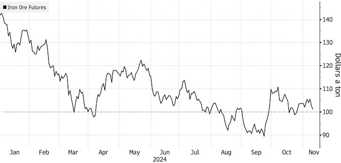 Цена на железную руду приблизилась к $100 за тонну, поскольку последние усилия Пекина по оживлению экономики разочаровали инвесторов, а увеличение запасов в китайских портах говорит о том, что предложение превышает спрос Динамика цен на железную руду. Источник: Bloomberg Фьючерсы на железную руду потеряли почти 2% на торгах в Сингапуре после резкого падения в пятницу, когда китайское правительство представило план обмена долгов, но воздержалось от мер по прямому стимулированию внутреннего спроса, в том числе в проблемном секторе недвижимости. Этот основной компонент для производства стали подешевел более чем на четверть в этом году из-за спада в секторе недвижимости Китая и признаков того, что горнодобывающие компании наращивают производство. Металлургические заводы в крупнейшей стране-производителе с трудом находят покупателей на свою продукцию на внутреннем рынке из-за слабого спроса. Однако экспорт сплава в прошлом месяце вырос до самого высокого уровня с 2015 года. Запасы железной