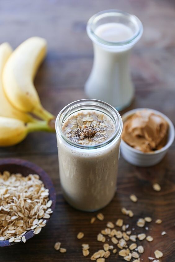 - В блендер положите банан, овсянку, протеин, молоко и мед.