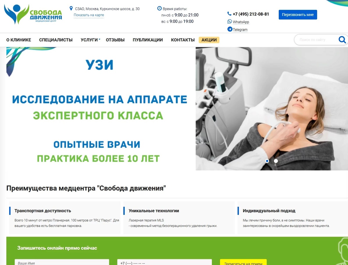 Благодаря профессионально проработанному сайту, медицинский центр «Свобода Движения» добился стабильного потока заявок и звонков на прием, при этом количество записей на прием увеличилось в 2,5 раза. Это наглядно демонстрирует, как комплексный подход к разработке и продвижению сайта может значительно повлиять на успех медицинского учреждения.