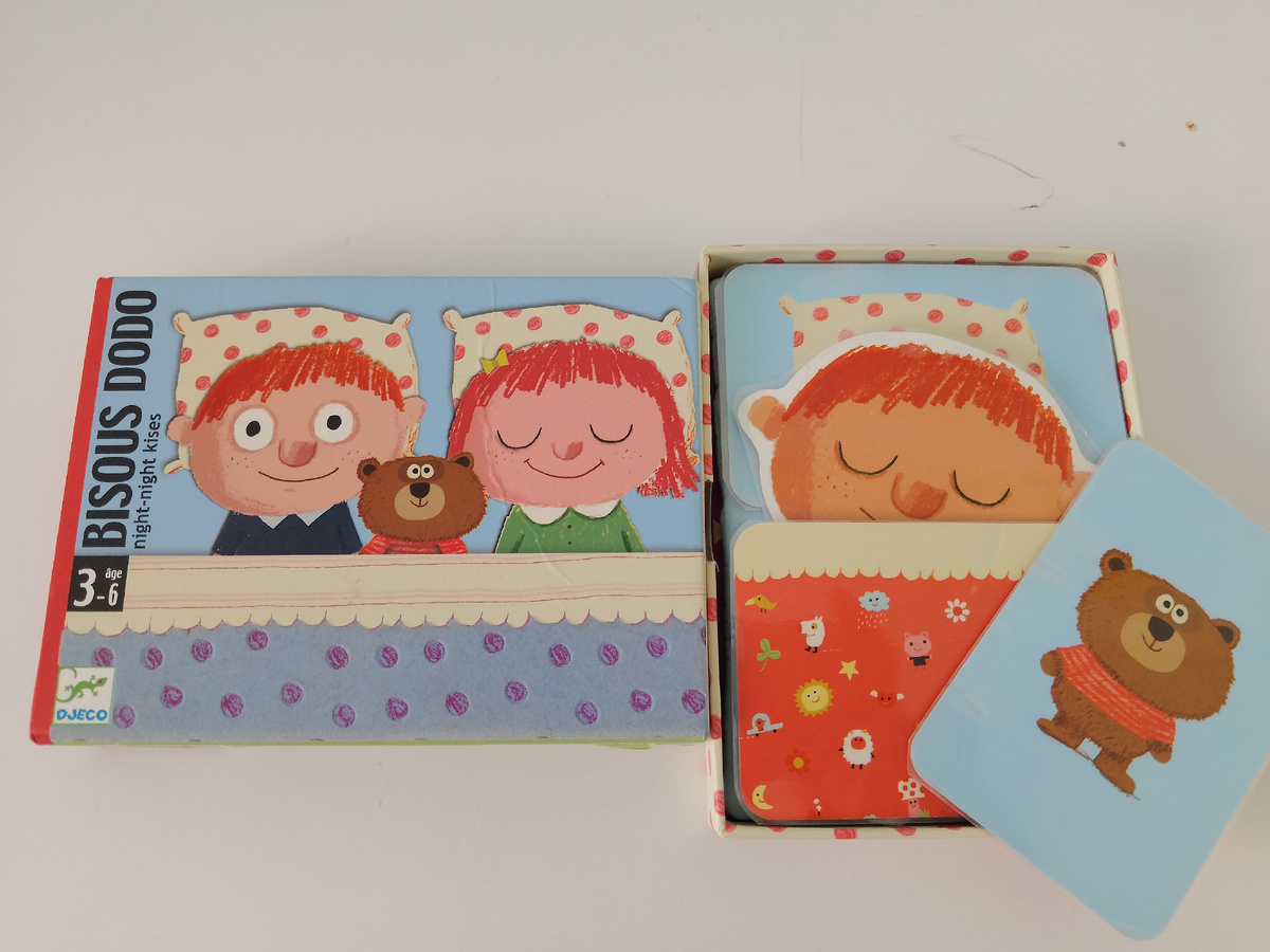 Это не просто красивое название, я правда так считаю. В этой игре есть всё, что нужно и подходит всём малышам от вселенной до школы( и подросткам даже): Это игра от Джеко "BISOUS DODO". Мы покупали для налаживания ночного сна. Хотели создать ритуал перед тем, как сын ложился в кроватку. И у нас получилось. Это вообще первая игра, которую мы купили ребёнку и она сейчас ( в 6 лет) не потеряла актуальности. Всё очень просто: нужно уложить мальчика или девочку спать ( девочку мы потеряли почти сразу после покупки игры и так до сих пор и не нашли). Для этого в колоде нужно найти подушку, мишку и одеяло. Карточки с изображениями этих картинок прячутся в колоде. Каждый берёт по одной и выполняет действие: поцелуй в животик, щекотка, потереться носиками, погладить, за чмокать и т. д. Изображения на карточках такие милые, просто насмотреться невозможно. Можно усложнить задачу и добавить в колоду солнышки... 1 солнышко-нужно взять 1 дополнительную карточку, 2 солнышка- 2 карточки...