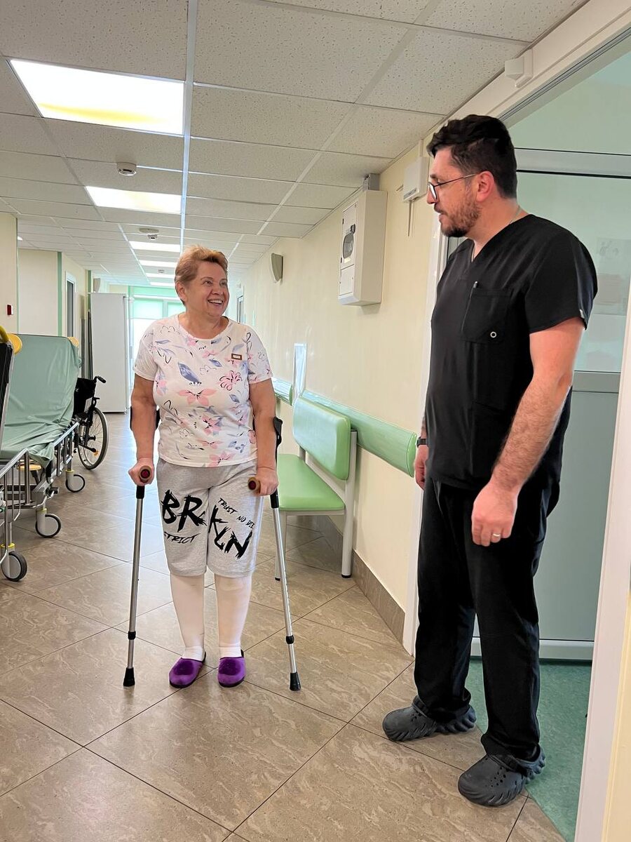 «Так, встаем, встаем!», – заходя в палату, обращается к своим подопечным врач-травматолог-ортопед Ардавазд Вартикян. «Познакомьтесь, это наша пресс-служба, они хотят с вами поговорить. Вы не против?». Из палаты к нам выходит миниатюрная женщина с удивительно добрыми глазами. «Конечно, не против!», – отвечает пациентка. «Меня зовут Людмила». Героиня нашей истории Людмила Желтикова. Вместе с мужем она живет в Северодонецке. Ее история — это пример силы духа и стойкости, которые помогают преодолевать любые преграды. «Всю свою жизнь я проработала в торговле. На работе приходилось проводить по 12 часов на ногах. Я приходила домой и просто падала от усталости. Ноги постоянно болели. Когда уже стала кладовщиком на большом складе, почувствовала, что уже не могу ни бегать, ни ходить нормально. Начала обращаться к врачам. Раз положили в больницу, два положили. Уже доктора подсказывали, что нужно на группу инвалидности сдать. Я чувствовала, что такими темпами не дотяну до 60. Оформила себе группу