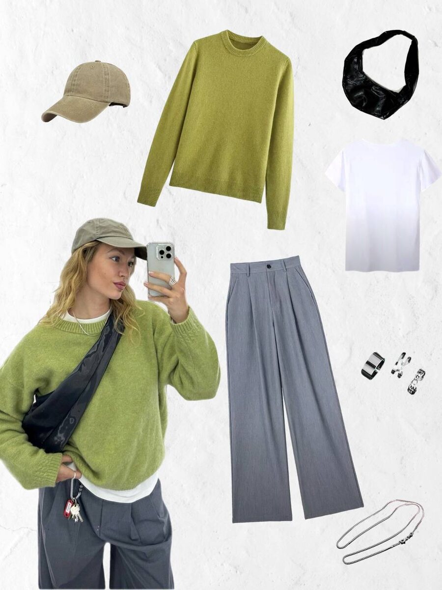 Повторяем легкий повседневный образ на каждый день 🤍 Его главная изюминка в деталях: кепке, кольцах, ожерелье и сумке через плечо. И, конечно, многослойности. Свитер Брюки Футболка Кепка Кольца Цепочка Сумка