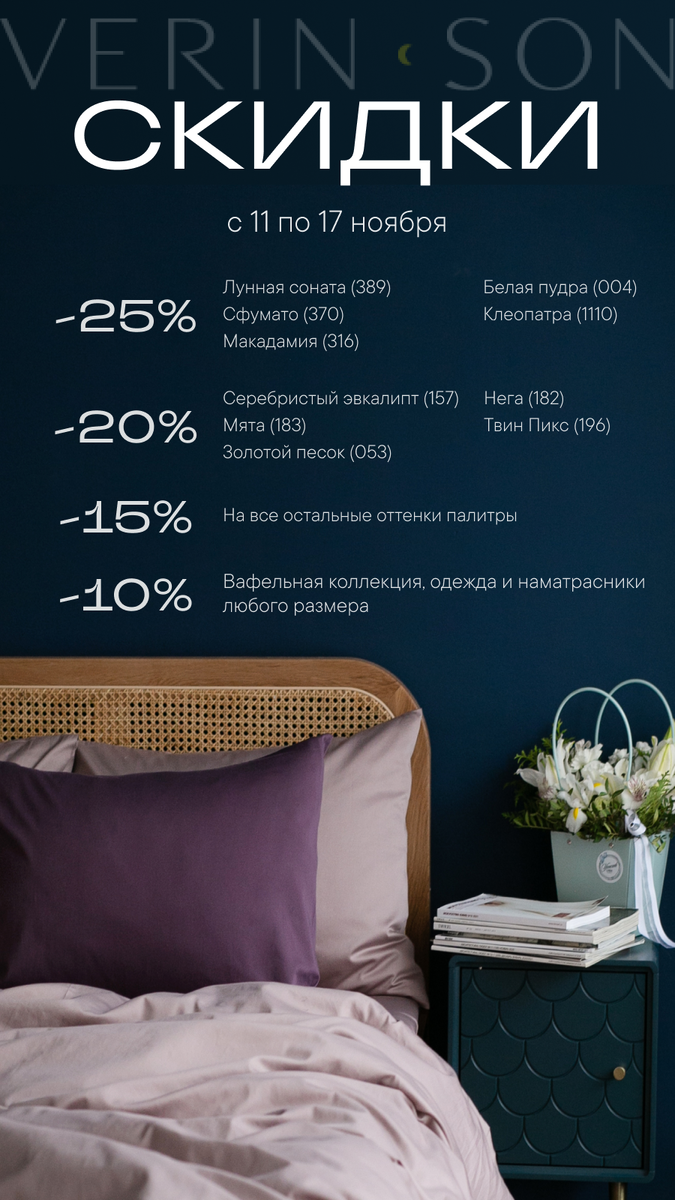 Вы так ждали ее! Скидки до -25% на все изделия! Предложение действует с 11 по 17 ноября, ловите за хвост возможность побаловать себя и приобрести подарки для близких по самым сладким ценам! Важно: величина дисконта зависит от оттенка, а не от размеров постельного белья. На одежду, наматрасники и аксессуары действует скидка 10% независимо от цвета. Желаю вам приятных покупок! Оформить заказ и ознакомиться с ассортиментом можно на нашем сайте Пусть эта акция станет приятным началом вашей недели!