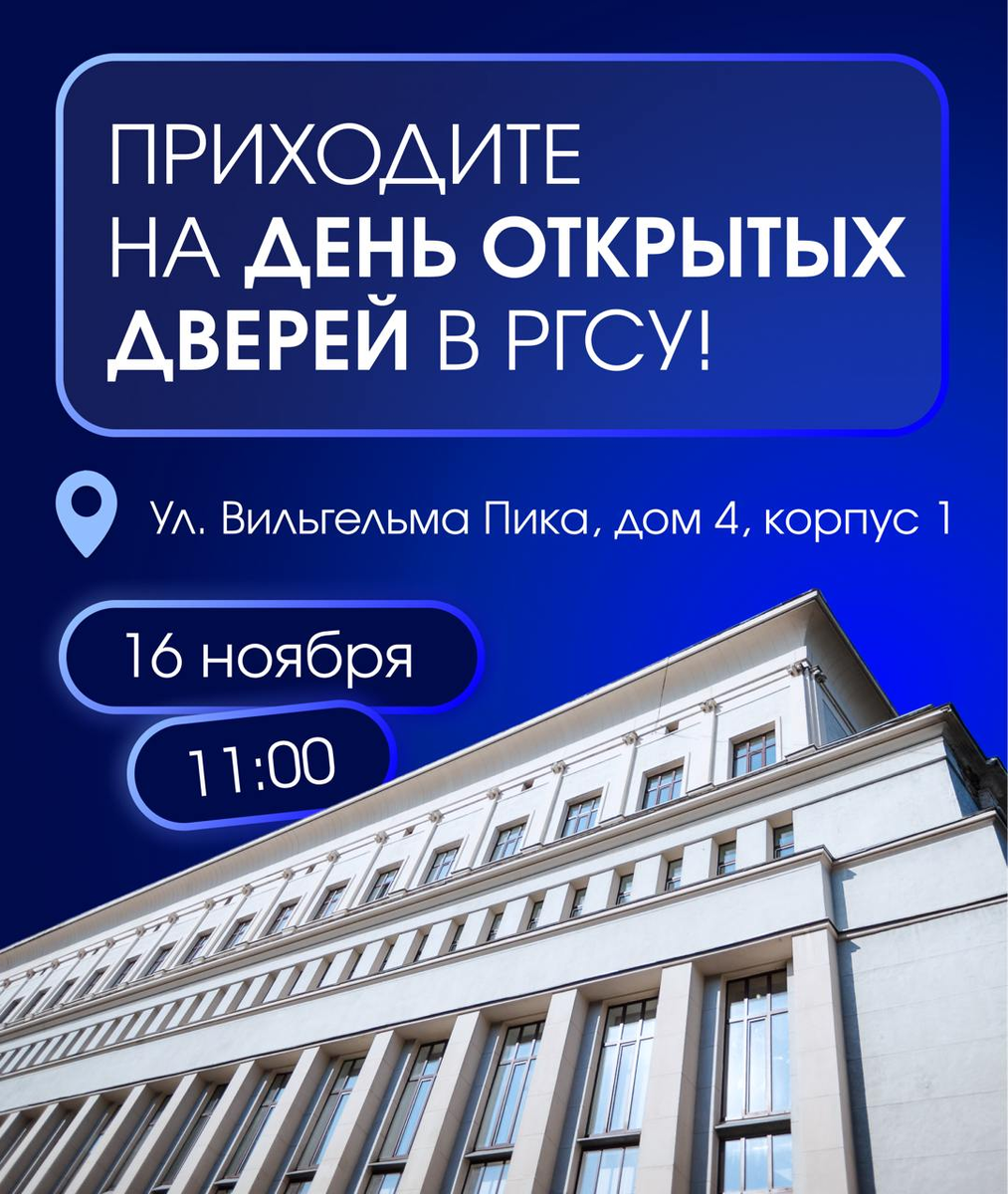 Когда ищешь место для учебы, возникает много вопросов. Каким окажется Университет? Как будет идти учеба? А чем заниматься в свободное от занятий время? На дне открытых дверей в Первом Социальном вы узнаете обо всем, что необходимо будущему студенту, и даже больше. Мероприятие пройдет 16 ноября, начало в 11:00. → Деканы, представители факультетов и колледжа РГСУ расскажут о программах обучения, преимуществах направлений и о том, кем ребята будут работать после выпуска; → активисты Университета пригласят в студенческие объединения и покажут, что каждый может развить свои танцевальные, вокальные и артистические таланты; → эксперты приемной комиссии подскажут, как заработать дополнительные баллы при поступлении или получить льготы на обучение. Регистрируйтесь и приходите по адресу: ул. Вильгельма Пика, 4, корпус 1.