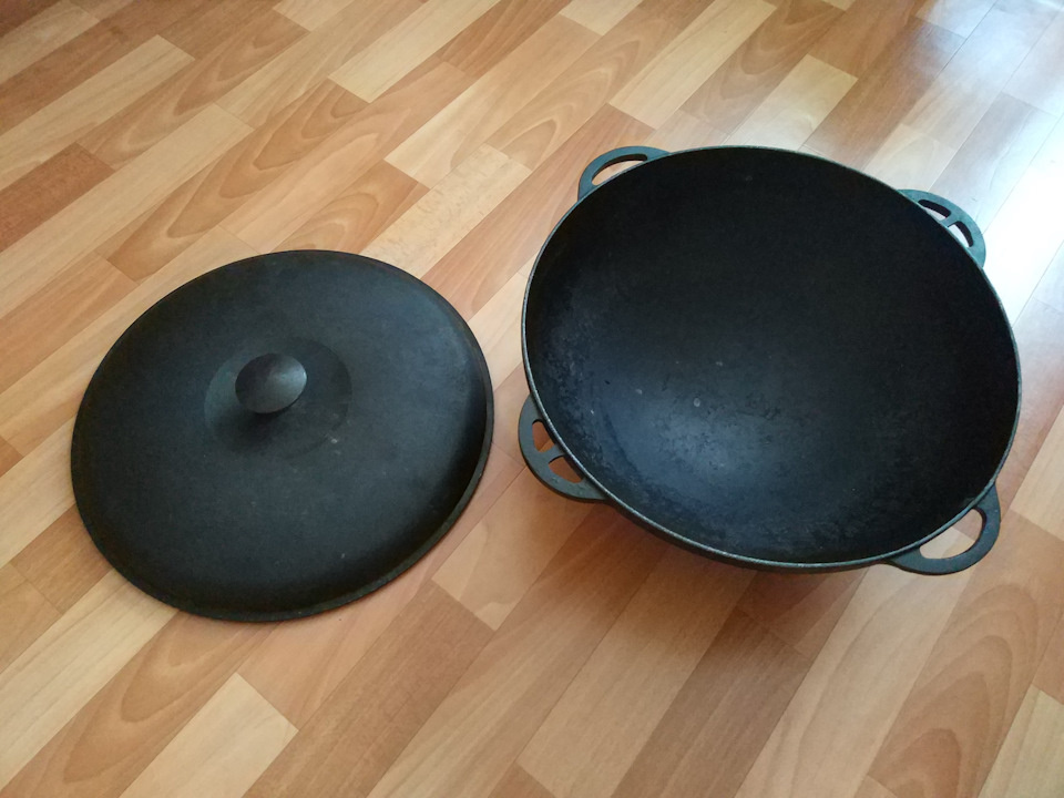 Желательно купить уже подержанный казан — в этом случае вам не придется его доводить до рабочего состояния. Если же вы покупаете новый казан — его надо подготовить перед первой готовкой. Для этого казан сначала протирают салфетками от заводского масла (пленка которого неизбежно будет на стенках), а затем прокаливают на сильном огне. Следите за температурой и не позволяйте сильно раскаляться чаше. После в казан заливают 300-400 грамм подсолнечного масла и в течение часа двух выкаливают на сильном огне, не забывая протирать маслом внутренние стенки. Задача процедуры — удалить из казана лишние примеси и пропитать поверхностный слой металла растительным маслом (Тефаль — мы всегда думаем о вас).
