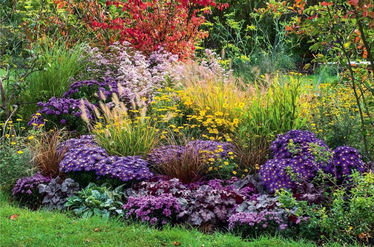 В данной статье собраны самые неприхотливые многолетники, которые зажигают сад красками, когда он уже готовится ко сну. Каждое из показанных растений не требует укрытия от холодов, а также ухищренных подкормок. Безвременник осенний Затейливый по типу развития цветок. Внешне схож с крокусами, хотя по форме бутонов все-таки немного отличается. Его высаживают в августе или сентябре. За отведенный срок растение успевает адаптироваться на новом месте. Цветение наступает в октябре, когда сад сбрасывает листья. Очиток видный Его соцветия нередко можно увидеть даже под снегом. Культура наделена высокой морозоустойчивостью и выносливостью к негативным факторам. Хороша в композициях и не является серьезным конкурентом для прочих соседей по клумбе. Гелениум осенний Терракотово-пурпурные, а порой и солнечно-оранжевые цветы геллениума распускаются ближе к концу лета. Высота растений от 50 до 130см. Им часто отдают роль заднего плана в цветниках, чтобы создать пестрый фон и не потерять визуаль