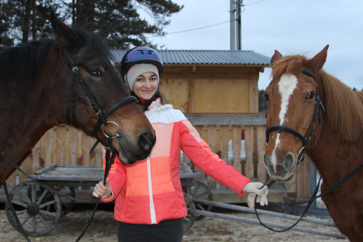 Ярослава уже верхом на 14-летней каурой Виктории вятской породы.