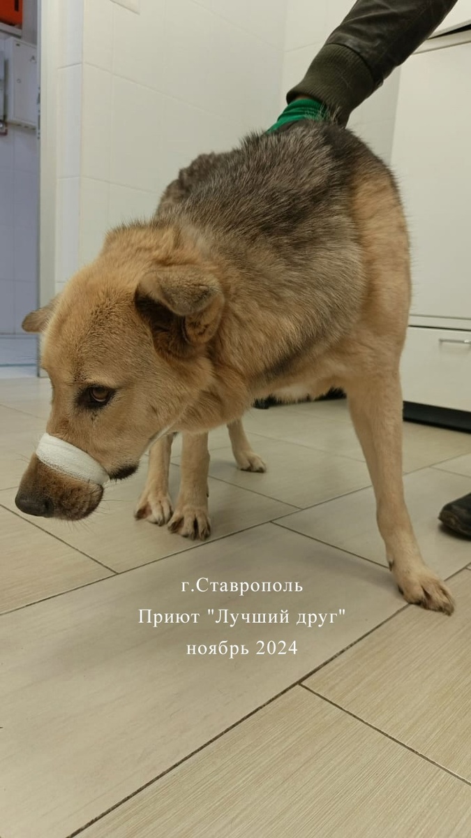 В 2021 году перед самым Новым годов в отлов поступил пес среднего роста, довольно крепкий и не слишком ласковый к людям. Сразу обратили внимание, что пес почти не встает на лапы. С трудом отвезли его в клинику, сделали рентген под наркозом. Всё очень печально. У пса пуля в шее, между атлантом и эпистрофеем, и пуля довольно большого размера. Она сместила позвонки в сторону и по всей видимости защемила нерв, сами позвонки давят на спинной мозг, вызывая контузию. Из-за всего этого Старый не чувствовал всю правую сторону, но мышечная чувствительность не была потеряна. Пока время не было упущено безвозвратно, решено было оперировать Старого. Операция сложная, поставили имплант, но без нее у Старого пса нет надежды встать на лапы, для крупного пса полный паралич равнозначен смерти. После операции пес долго восстанавливался, поправился и продолжал жить в вольере.