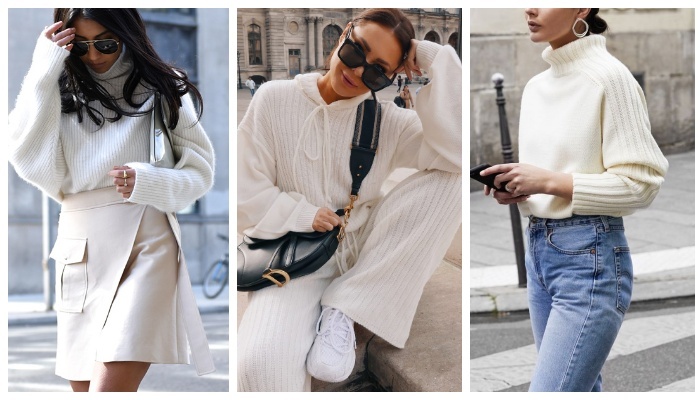 Настал тот момент, когда хочется укутаться в уютные вещи. В данном обзоре стилисты продемонстрируют на примерах, какой свитер сделает ваш образ уютным, атмосферным и стильным. Осенью особенно популярен белый оверсайз свитер. Существует множество моделей этого вязаного изделия, начиная от удлиненных минималистичных и заканчивая укороченными вариантами с ажурными вставками. Первый вариант уютного образа, включает в себя белый вязаный свитер с круглой горловиной и объемными рукавами, а также теплые и комфортные трикотажные брюки молочного цвета с высокой талией в мелкий рубчик. Комфортный повседневный look включает в себя свитер белого цвета, базовые джинсы скинни голубого цвета, а также громоздкие светлые кроссовки на массивной подошве. Трендовый свитер из объемной пряжи + синие джинсы + замшевая куртка коричневого цвета — отличный вариант аутфита на каждый день. Полюбуйтесь на эту воздушную и элегантную красоту — свитер белого цвета с объемными рукавами и высокими манжетами, украшенный
