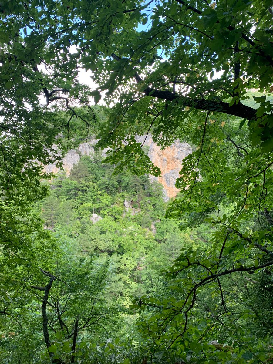 В этом месте начинается пеший спуск к большому каньону. Отмечу, что большая его часть оборудована ступеньками и перилами, поэтому идти и глазеть по сторонам на горные вершины и зеленые заросли было одним удовольствием. Которое, правда, длилось недолго))