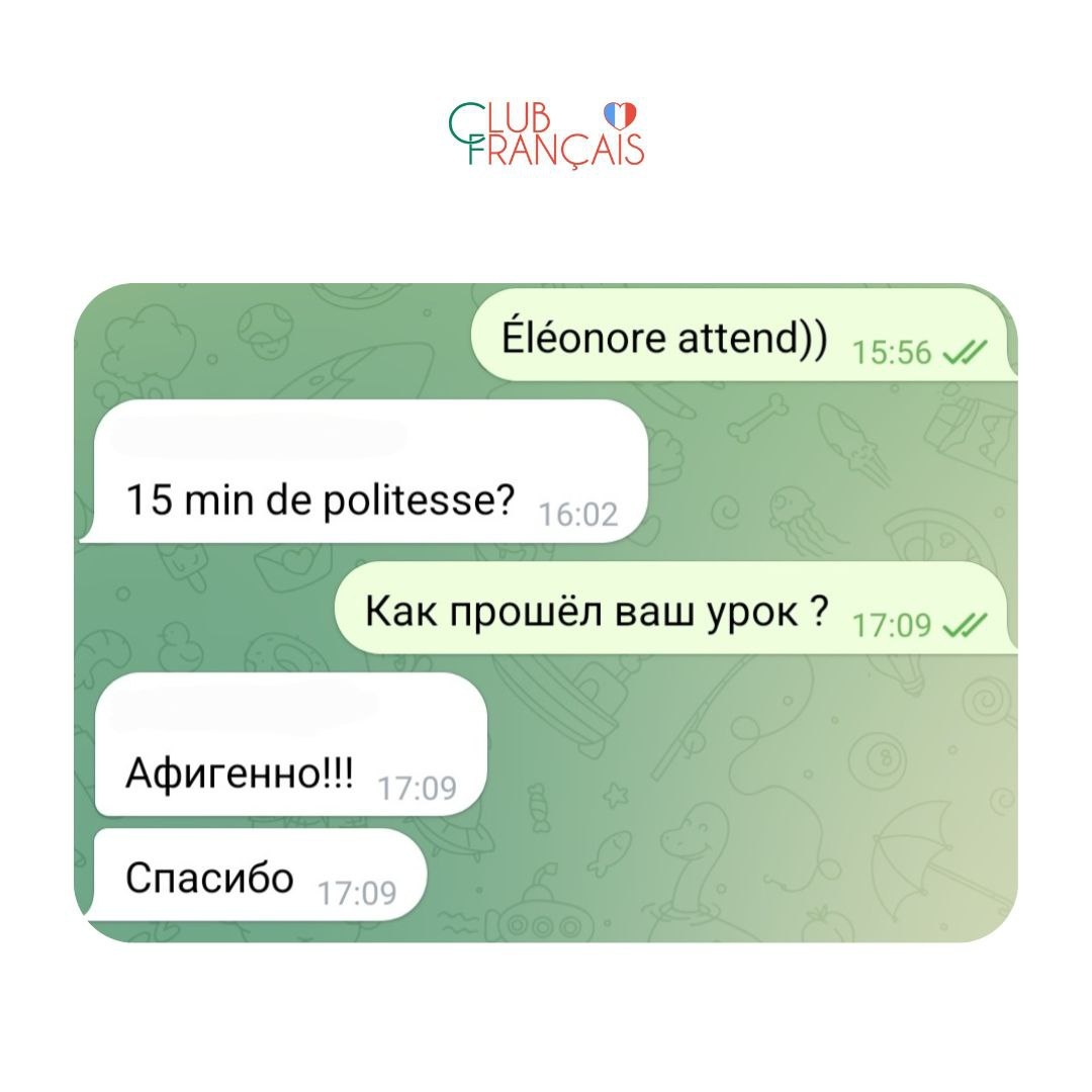 Первое общение с нашими француженками впечатляет настолько, что некоторые могут выразить это лишь одним словом👆 Хотите тоже попробовать себя в общении с француженкой? Завтра пройдет очередная встреча участников разговорного клуба с уровнем В1+ В этот раз поговорим об актерах кино. 🕚Время встречи: 12 мск 📰Тема встречи: Icône du cinéma 🎯Цель встречи: рассказать о знаменитых актерах кино в России и любимых актеров Франции, прокомментировать цитаты Алена Делона. Встреча пройдет с француженкой💙🤍❤️ Напомню, теперь вы можете оплатить всего один урок или подписку целиком. Поэтому, если вам интересно проверить свои навыки общения на тему завтрашнего дня, ждем вас в клубе! ❕Стоимость 1 встречи для уровня В1+ 1300 рублей. ❕Пробный урок - 500 рублей. 🇫🇷Скорее записывайтесь, количество мест ограничено: https://francaisclub.ru/parler/