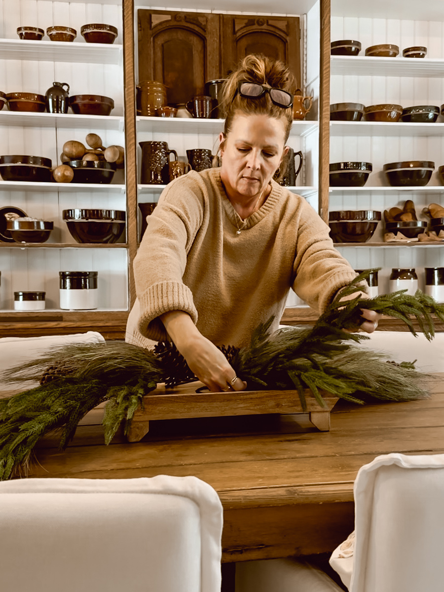 Из рассказа Дэб и Даниэль, которые ведут уютный блог... Они рассказывают о том, как просто привести домашний декор своими руками в следующий сезон, а именно зимний сезон. Сегодня мы поделимся с вами, как они переделали свой обеденный стол с осени на зиму всего с тремя предметами для декорации! Нам нравится, как все у них получилось. А вам? Ночью здесь, в Огайо, температура падает до 0 градусов, и они чувствуют, как зимний сезон быстро подкрадывается! 1. Советую начинать с центрального , а именно с деревянного подноса , чтобы придать ему немного дополнительной высоты. У меня уже пару лет есть этот поднос от Wayfair, и его нет в наличии, но у них есть так много других удивительных деревянных подносов на выбор. 2. Далее фальсифицированные сосновые ветви. Они приходят в комплекте из четырех штук. Их можно использовать круглый год, но мне нравится использовать их зимой, так как они добавляют изюминку в холодные месяцы. Они сделаны из мягкого на ощупь пластика, и каждая ветвь имеет с